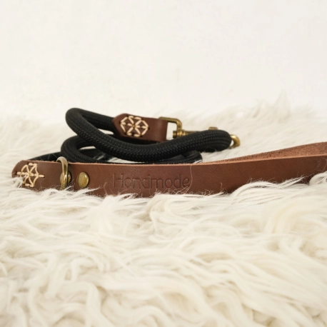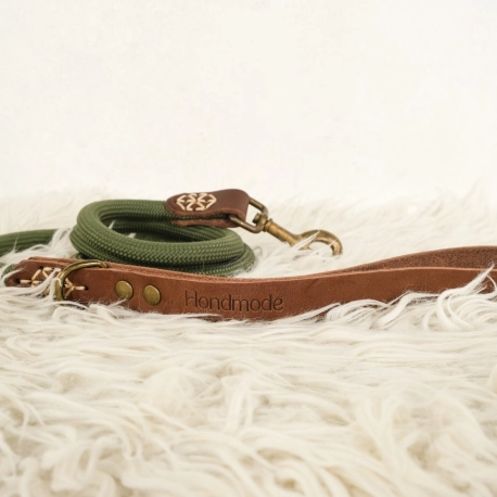 Het stevige handvat is gemaakt van hoogwaardig echt leer, waardoor het zacht in de hand ligt en jarenlang meegaat. Het soepele touw zorgt voor een comfortabele grip en voorkomt schokken tijdens het uitlaten. Dankzij de antiek messing gespen en haken heeft de lijn niet alleen een luxe uitstraling, maar ook de duurzaamheid die je mag verwachten van kwaliteitsmaterialen.